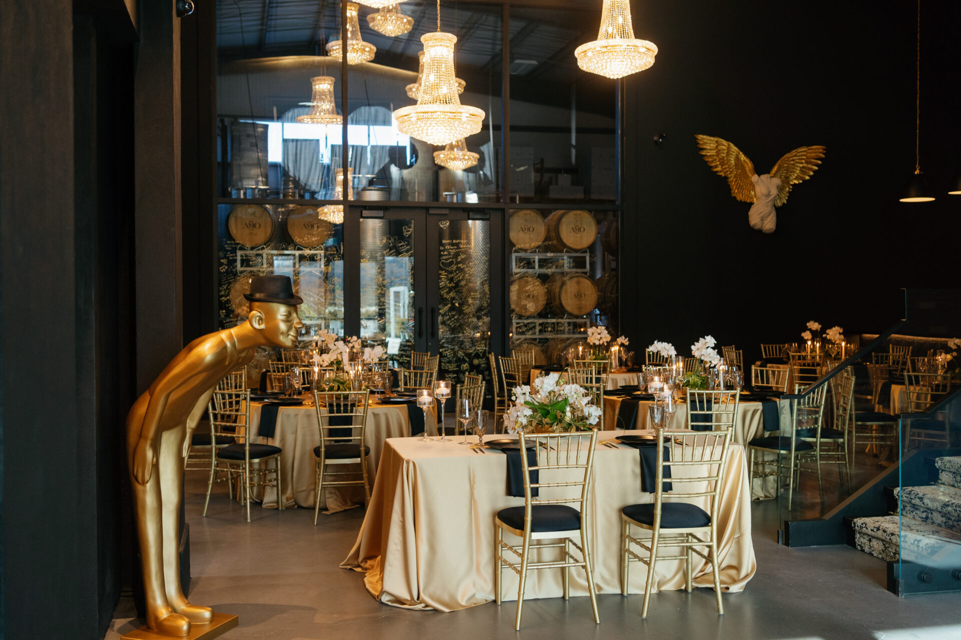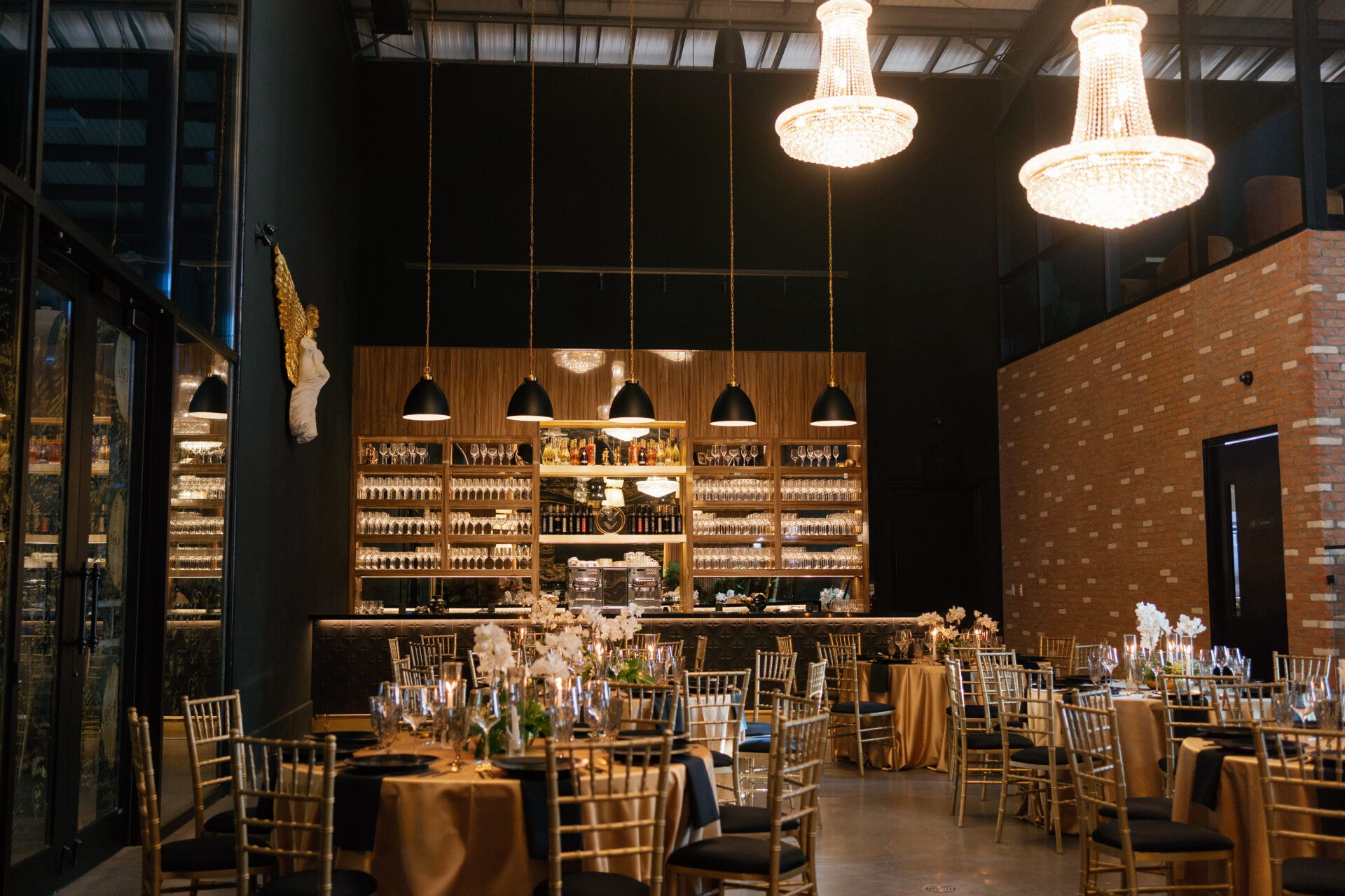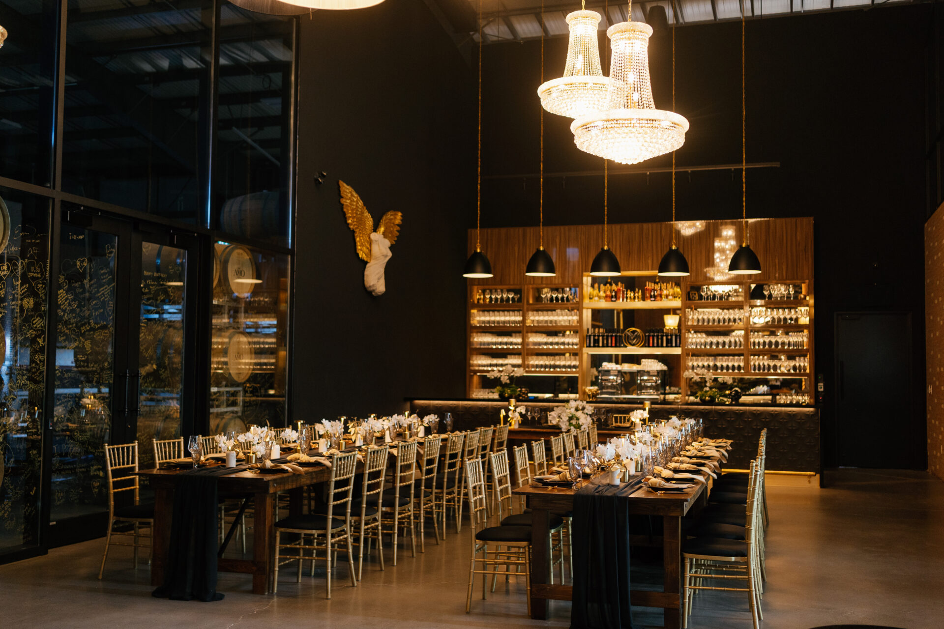 Designed with elegance and flexibility in mind, the Tasting Room is ideal for wedding receptions that feel elevated yet inviting. The space can be styled for cocktail-style celebrations, harvest tables, or traditional round seating. Plush lounge furnishings, soaring ceilings, and a striking bar create an atmosphere that is both luxurious and welcoming. Whether your vision is modern and chic or romantic and intimate, the Tasting Room adapts beautifully to your celebration.